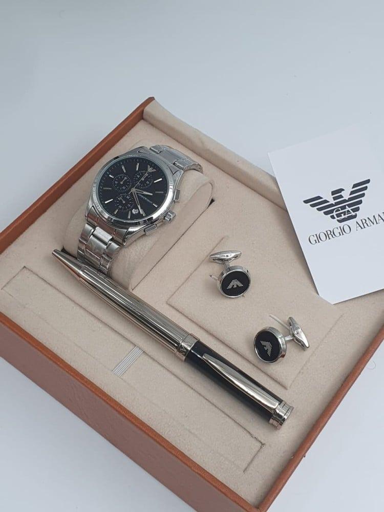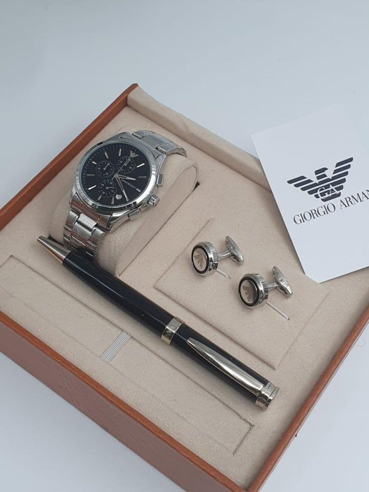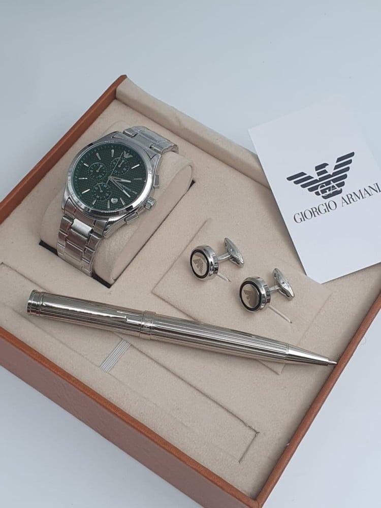 طقم ساعة مع وكبك مع قلم فاخر من ماركة جورجيو ارماني يتكون من زوج من الكبك وقلم وساعة رجالية انيقة، يتميز هذا الطقم أنه مصمم من افضل خامات أنواع المعدن الثقيله ومن ماركة غنية عن التعريف.